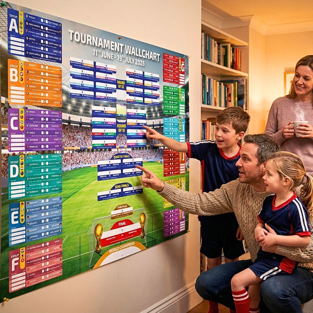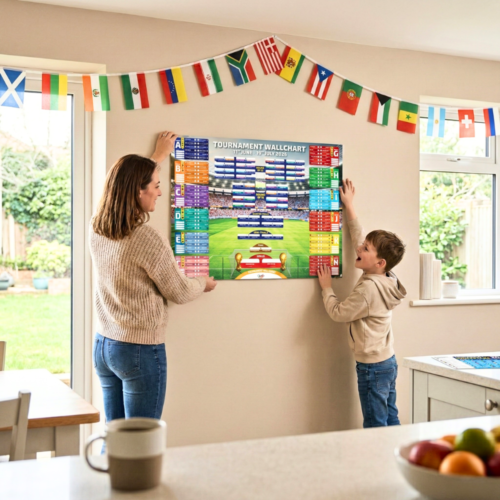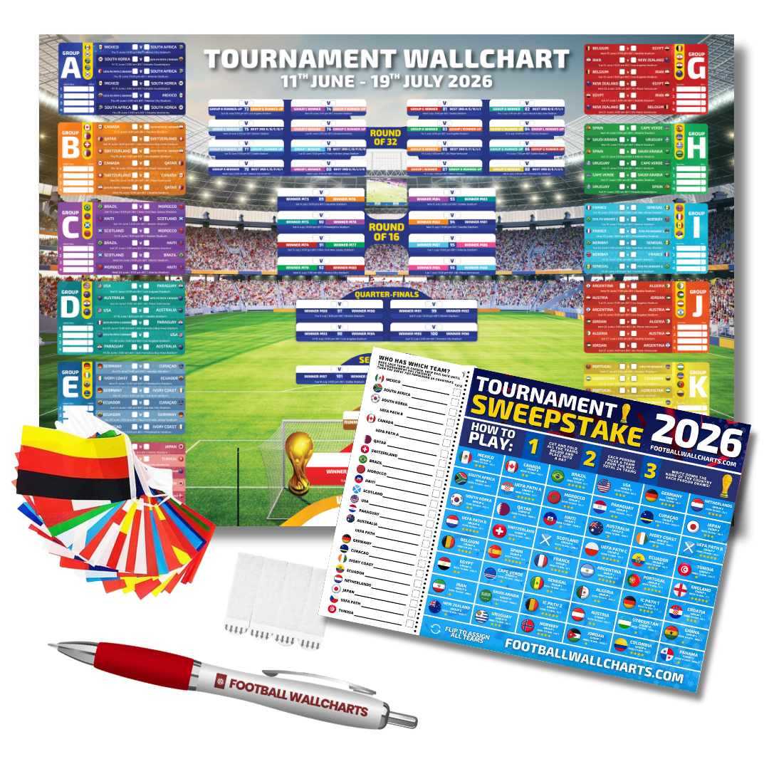 Everything you need to follow every match of the biggest World Cup ever. Wallchart, 48-nation flags, sweepstake kit, pen and hanging strips — all in one complete bundle.